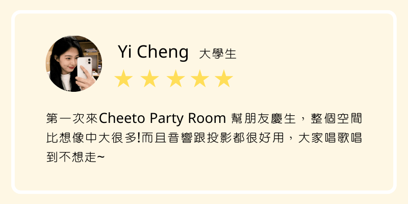 Let's Cheeto, Let's Party! 立即預約 Cheeto Party Room 七逃派對位於台北西門町,多種設施保證玩到不想回家!場地租借採預約制包場,超舒適環境給你最自在的派對體驗!無論是生日派對、單身派對、同學聚會、節慶派對、公司聚會、雞尾酒會或只是想找個地方吃喝聊天,不論大人小孩,Cheeto Party Room 都是你的台北派對場地租借最佳選擇! 55坪舒適寬敞的自助式獨立空間 交通方便,位於西門站6號出口旁邊 客人可額外佈置裝飾,令派對更有特色 備有多元化娛樂設備 超大夢幻球池讓你找回童心 繽紛自拍區讓你輕鬆記錄美好回憶 KTV專區廣闊空間盡情嗨 時尚留言板讓你拼出派對氣氛 電玩桌遊區隨時更新 好評推薦 View this post on Instagram A post shared by 噗!麥鬧啊 (@pumainaua) View this post on Instagram A post shared by 可樂|雙寶媽咪👦🏻👧🏻 (@cola0704_) View this post on Instagram A post shared by 玄忄音學姐ʕ̡̢̡ʘ̅͟͜͡ʘ̲̅ʔ̢̡̢⋆♡.∘ .*。⋆美妝|開箱|探店 (@xuan211_) 還有更多等您發掘! 更多設備 Phone-square-alt Line Facebook-square Instagram Facebook-square Instagram